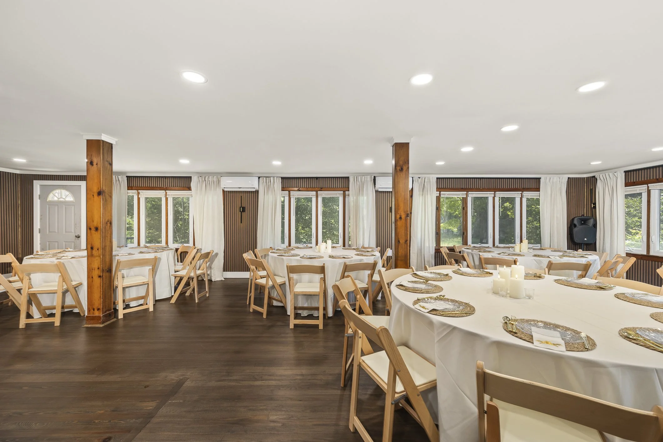 The Carter Bridge Estate banquet hall is a spacious, light-filled venue that seats up to 60 guests, with room to add additional tables and chairs for larger gatherings.